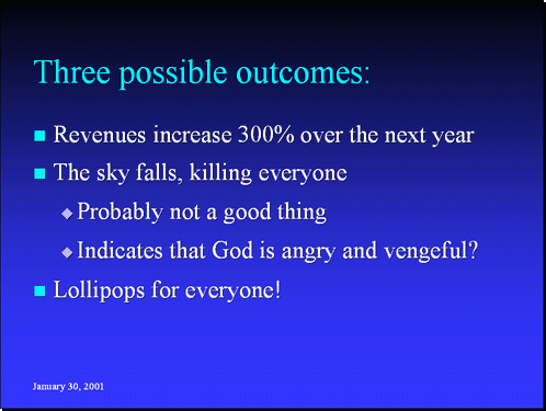 [2] Especially since openly I stole the format (but not the title) from G. Beato’s Soundbitten, and his one question interviews. Oh, and also since The Industry Standard not-so-openly stole the format and the title for the front of their book.