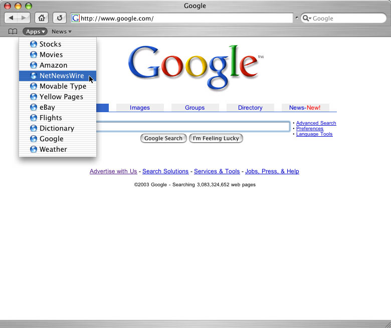 This keeps all the activity commonly referred to as “web browsing” in one place. Assuming Apple would also add the capability for tabbed browsing, the Safari/Sherlock combo would be a powerful one. The generic web browser part would allow people to load up any old web page while the applications would allow them to quickly take care of frequent tasks through custom interfaces without the need to load potentially heavy or hard-to-use web pages.