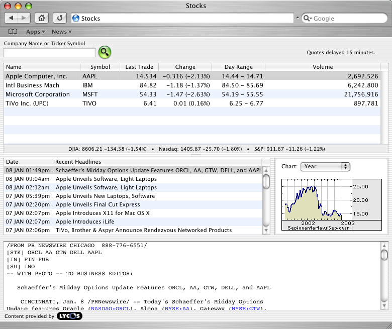 Figure 2 (bigger) shows the Stocks application loaded into the browser window after being selected from the Apps menu. It works just like it would within Sherlock with a fast, customized interface for looking up stock quotes, viewing charts, and reading related headlines.