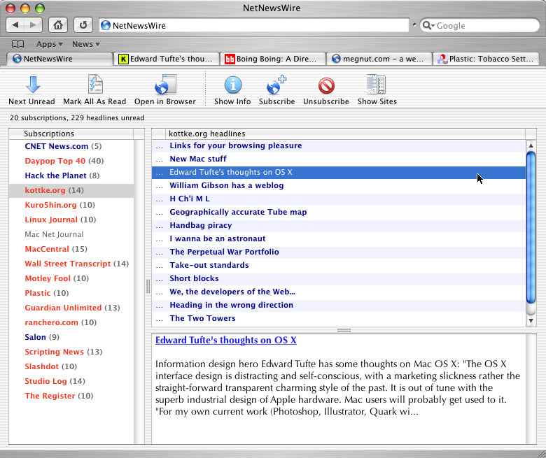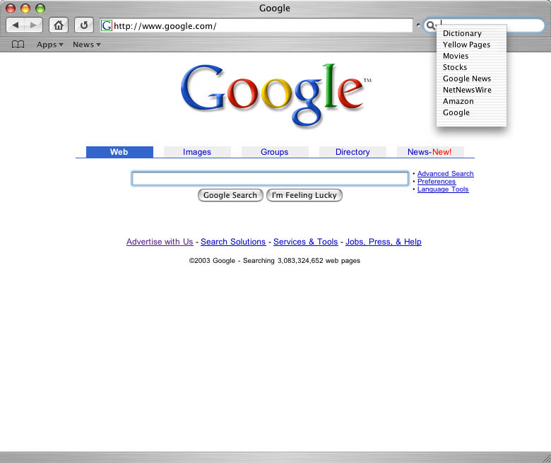 Safari is still in beta so it might be unfair to criticize too much, but Apple missed an opportunity to innovate the browser in a truly useful way. A web browser is a tool for people to get information from the web. Much recent effort has gone into developing other interfaces through which to do just that. With Watson, Sherlock, and NetNewsWire, you “browse” the web for specific kinds of information with interfaces custom built for each task.