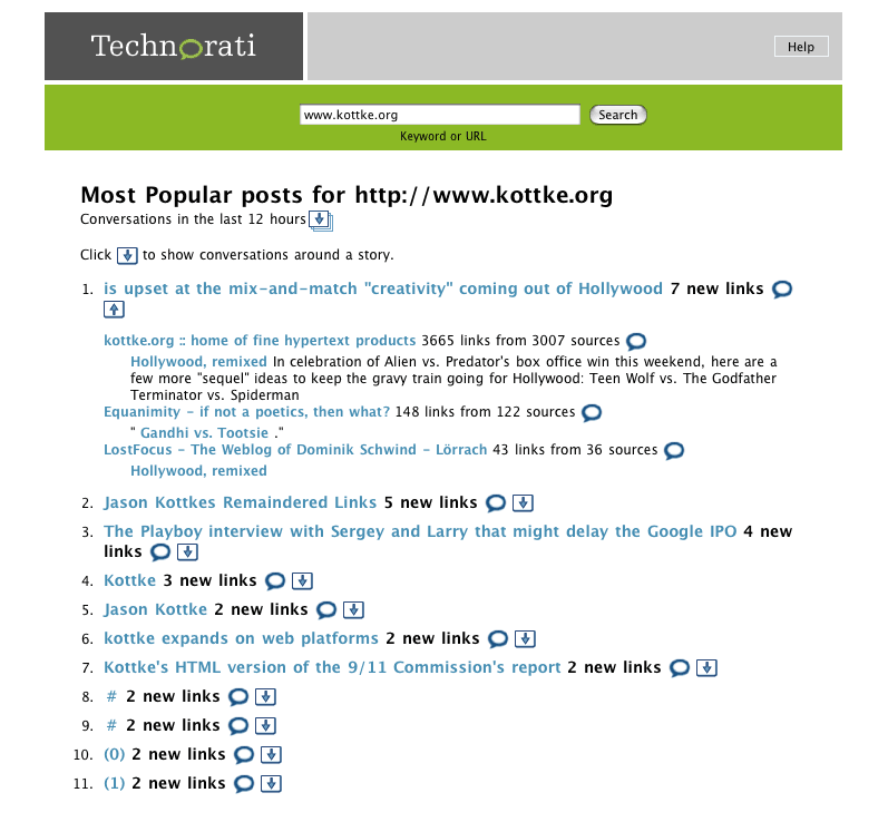 Technorati testing threaded “conversation” view?. Took me about 10 times as long to find new links to my site compared to the old flat layout.