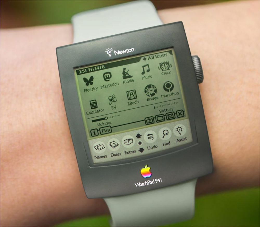 An Apple Watch reimagined in the style of a Newton. Love the app icons for Bluesky, BBEdit, and Marathon.