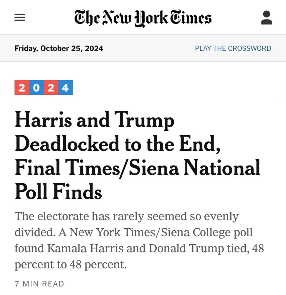 Polls are not votes. The candidates are not deadlocked. There is no ahead or behind, even ‘with 72% of precincts reporting’ on election night. The way elections work is they’re 0-0 all the way up until the votes are counted and then someone wins.”