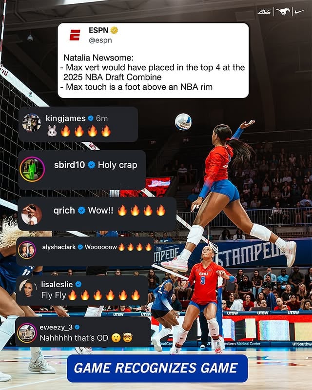 Natalia Newsome is a 5’11” sophomore volleyball player for SMU; she’s got a 40-inch vertical and can touch almost a foot above a regulation basketball hoop. It is bananas how high she rises when spiking the ball.
