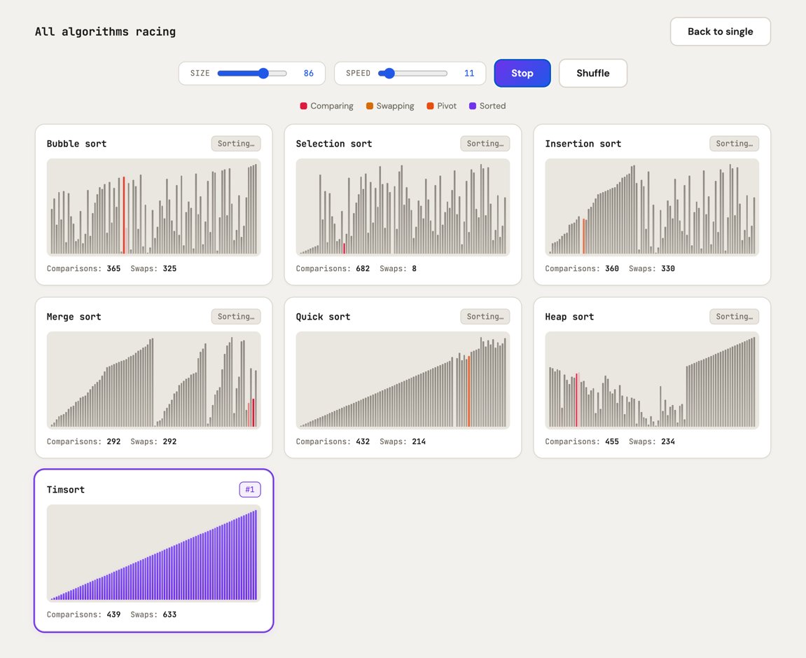 A comparison of different sorting algorithms (bubble, merge, heap, timsort). You can run them one at a time or race all seven.