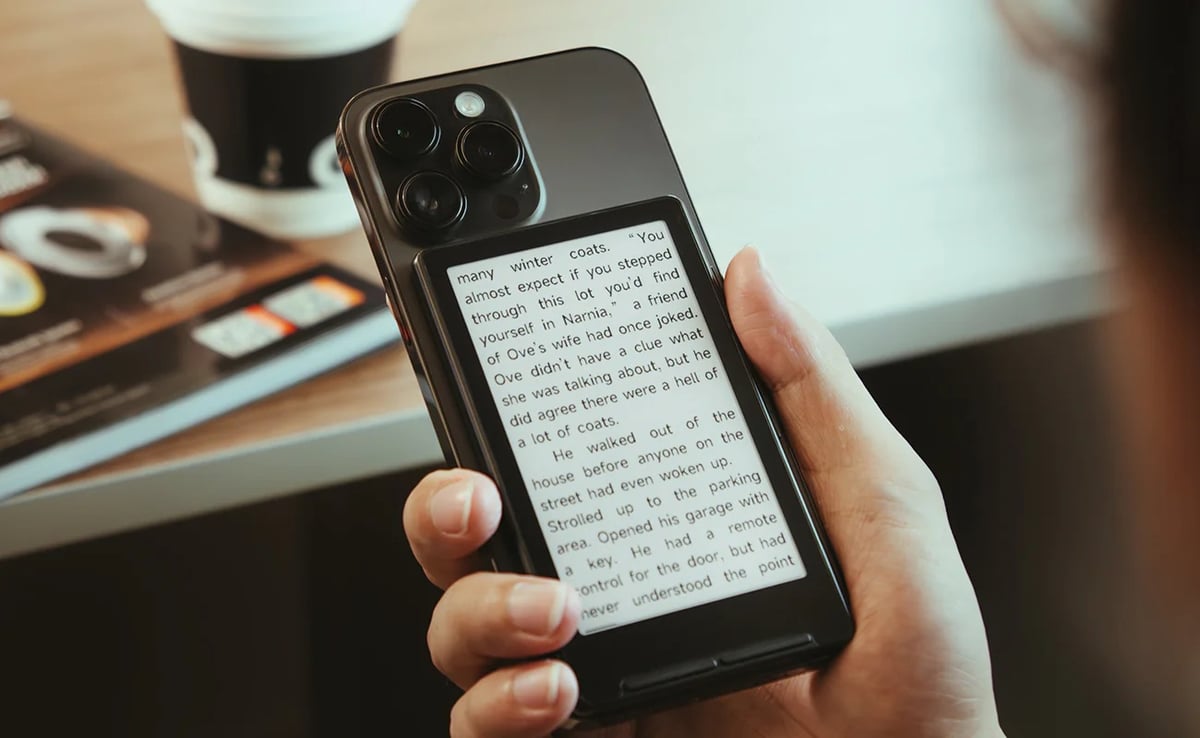 This tiny e-ink reader is small enough to attach to the back of your phone.