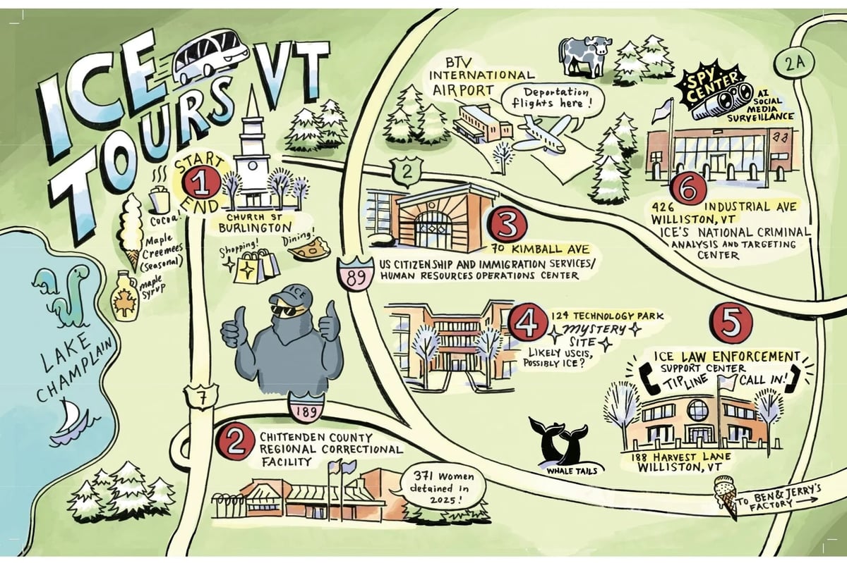 “ICE Tours VT provides guided bus tours to many of these facilities, where you will learn about the scope, scale, and history of DHS in Vermont. Think Hollywood star tours, but instead of celebrity mansions you get federal surveillance infrastructure.”